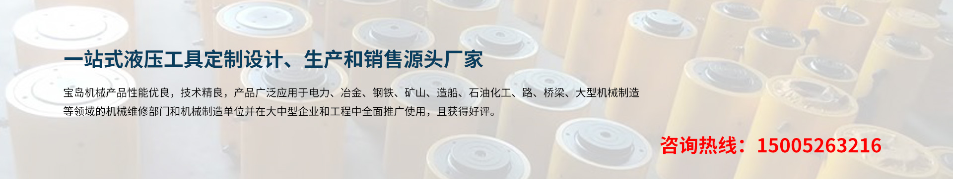 泰州市寶島機械制造有限公司位于長江三角洲著名的工具制造基地 -- 江蘇泰州。京滬、寧通高速公路,新長、寧啟鐵路貫穿全境。交通運輸條件十分便利。 BDYYJX寶島機械制造公司專業(yè)生千斤頂、液壓千斤頂、電動液壓千斤頂、大噸位千斤頂、薄型千斤頂、橋梁千斤頂、同步液壓千斤頂、空心千斤頂、自鎖式千斤頂;液壓螺母、液壓螺栓拉伸器;液壓扳手、電動(手動)液壓扳手;液壓彎管機、電動(手動)液壓彎管機、液壓彎排機;試壓泵、電動試壓泵;軸承加熱器、微電腦軸承加熱器、感應(yīng)拆卸器;液壓拉馬(拔輪器)、電動小車式升降液壓拉馬;螺帽破切器、液壓沖孔機、液壓平彎機、液壓開孔器、母線加工機、電動液壓升降(平臺)機等液壓工具。 是國內(nèi)液壓機電業(yè)配套的綜合性企業(yè),服務(wù)于國內(nèi)各類大中型企業(yè)。 寶島機械產(chǎn)品性能優(yōu)良,技術(shù)精良,產(chǎn)品廣泛應(yīng)用于電力、冶金、鋼鐵、礦山、造船、石油化工、路、橋梁、大型機械制造等領(lǐng)域的機械維修部門和機···